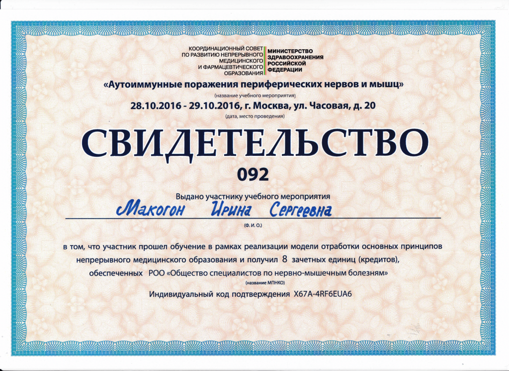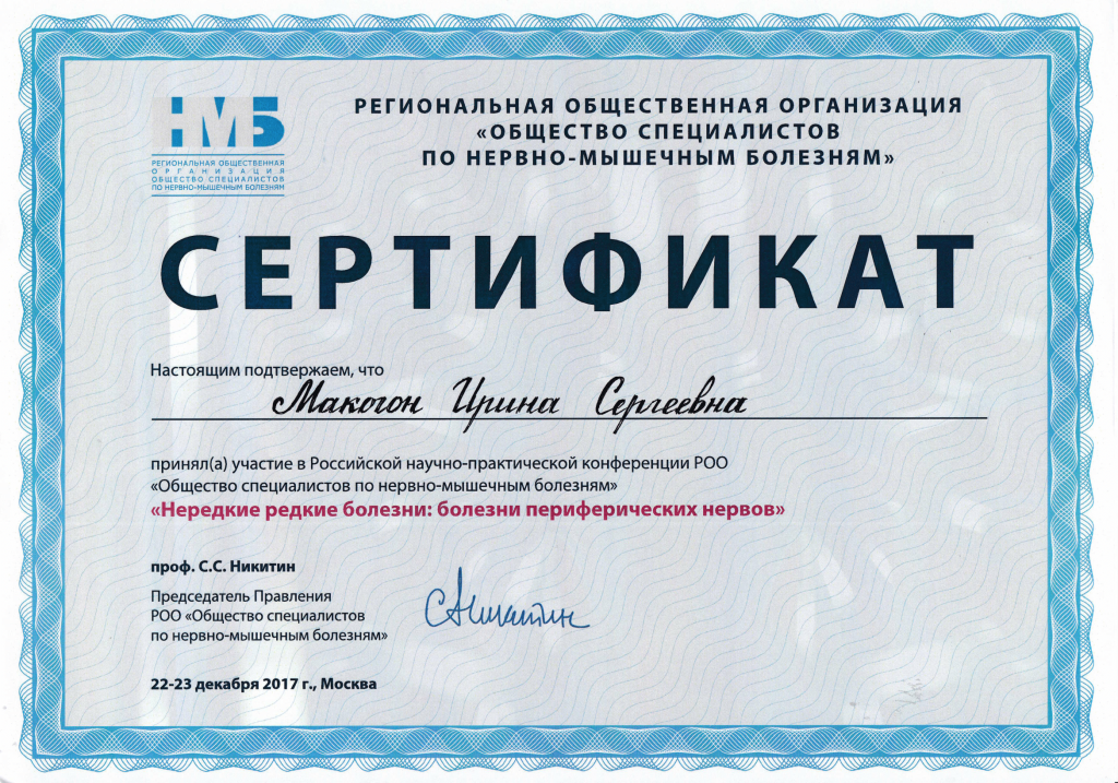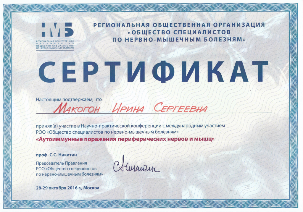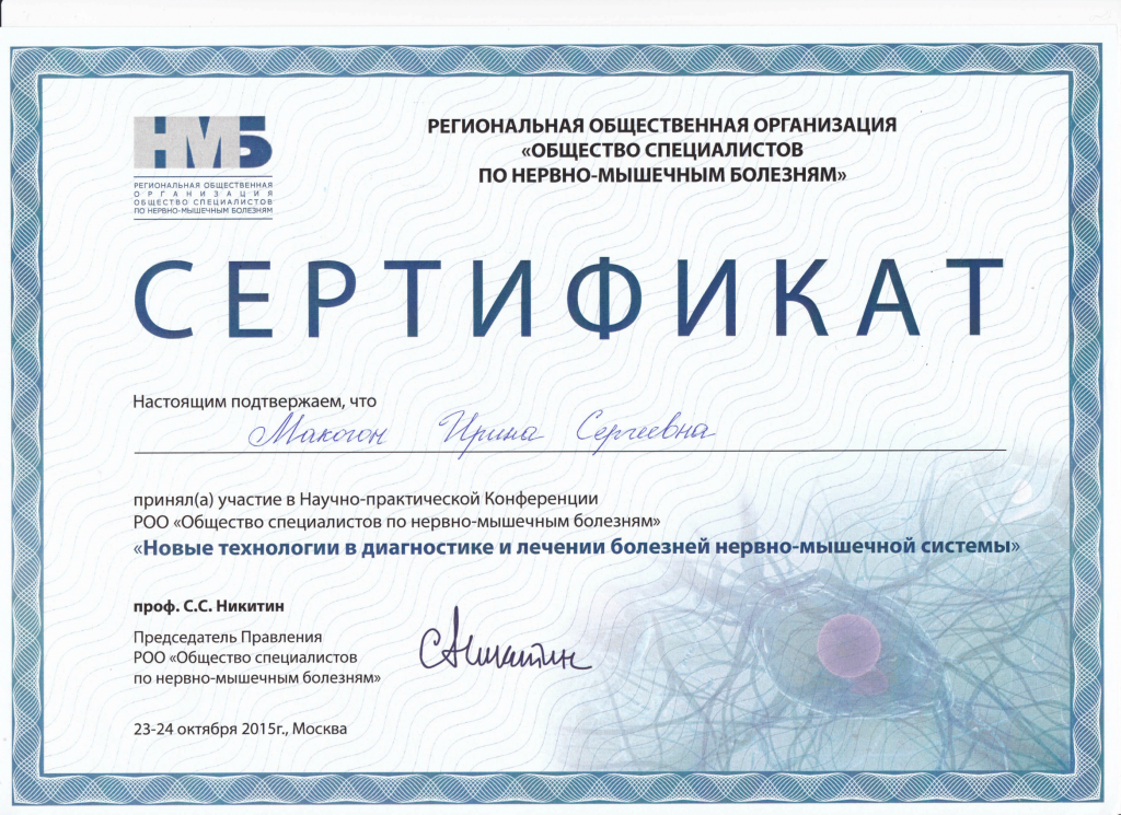 Сертификат РОО "Общество специалистов по нервно-мышечным болезням"