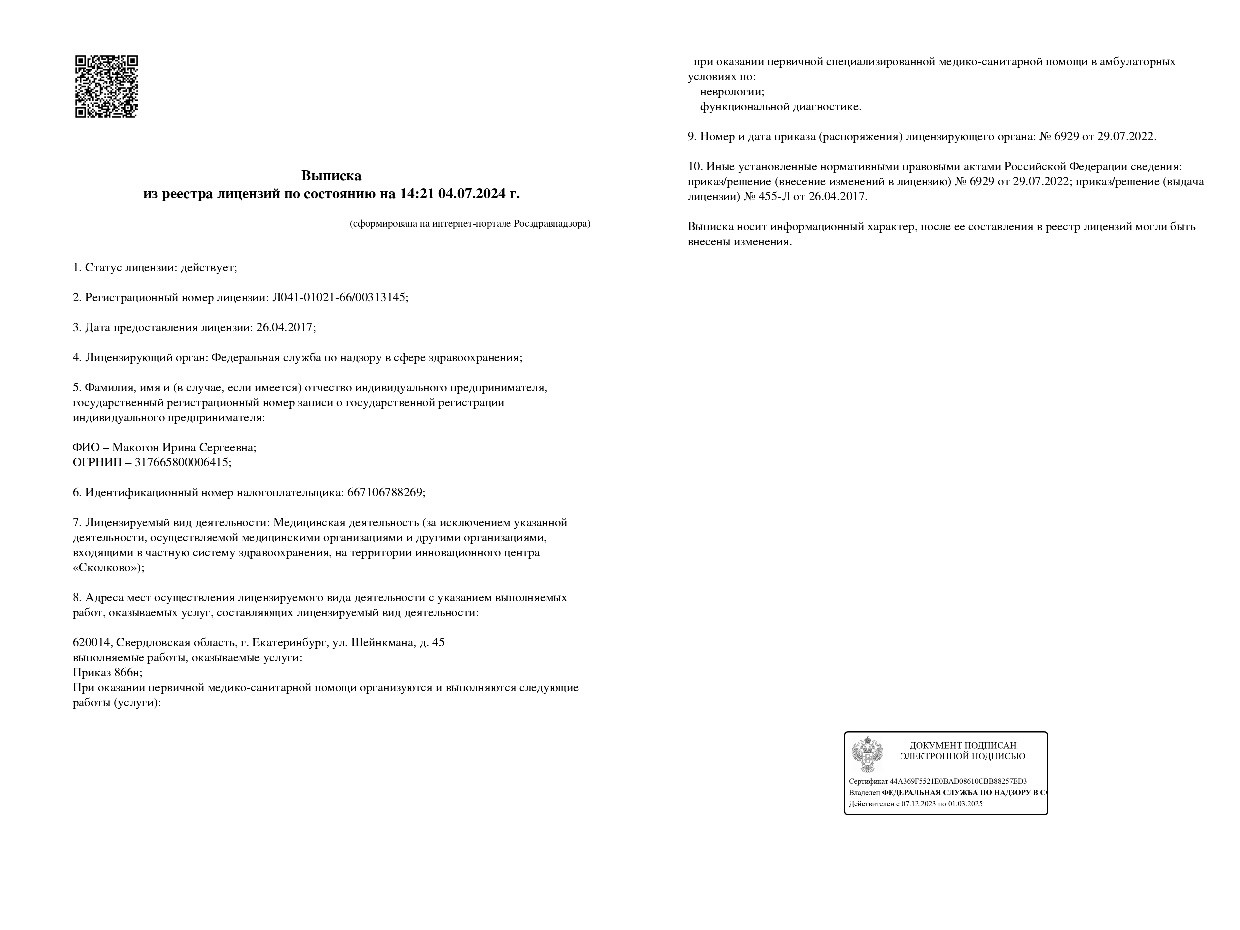Выписка из реестра лицензий на медицинскую деятельность ИП Макогон Ирина Сергеевна